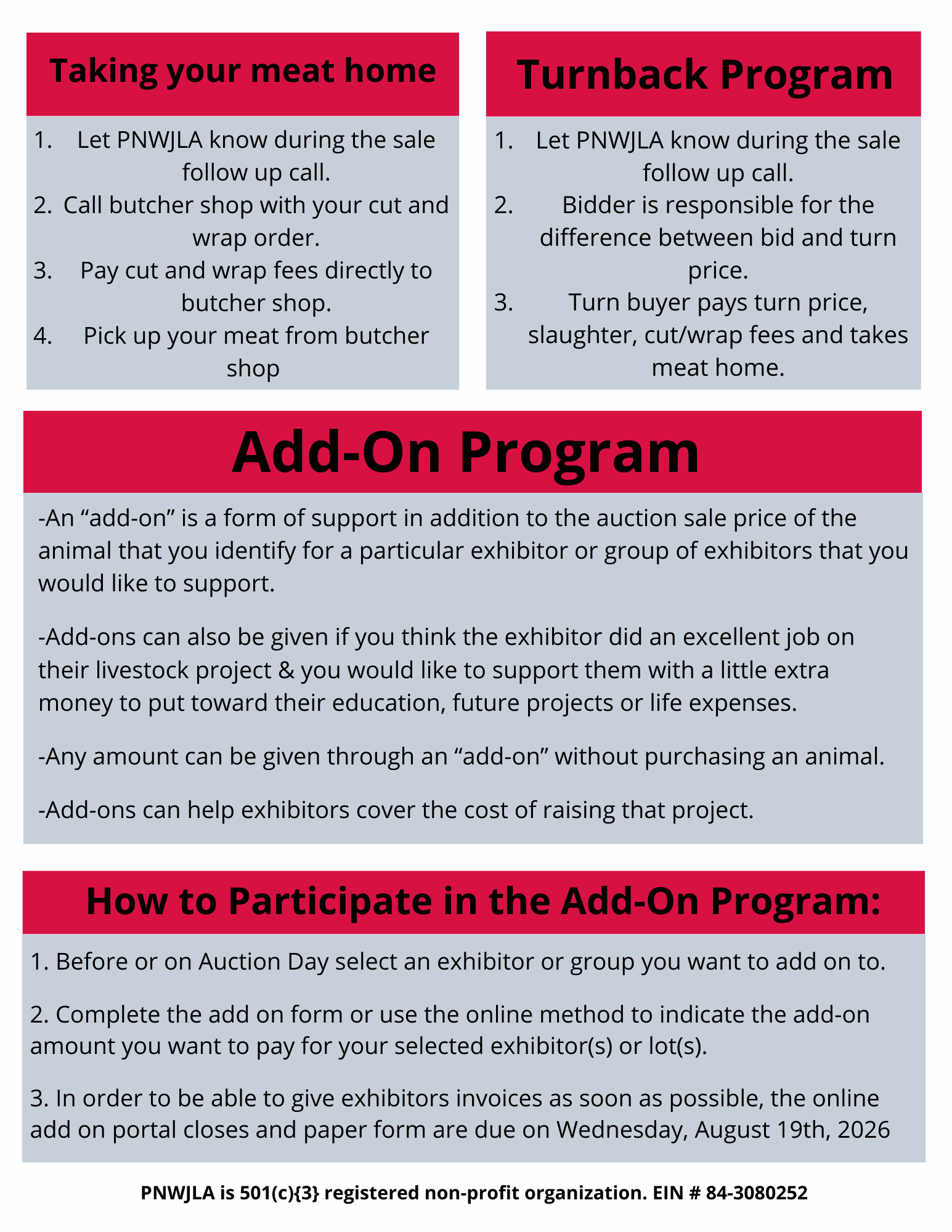 How do I purchase for more than one organization? You can register multiple numbers if you have multiple email addresses or just use one number and tell PNWJLA how to split your purchases after the sale.